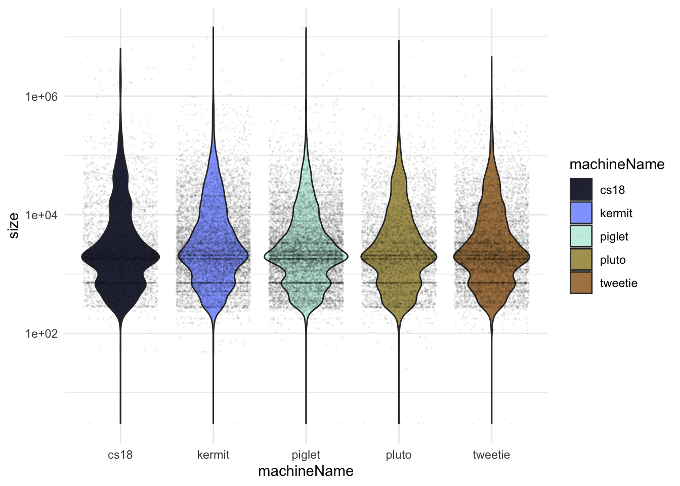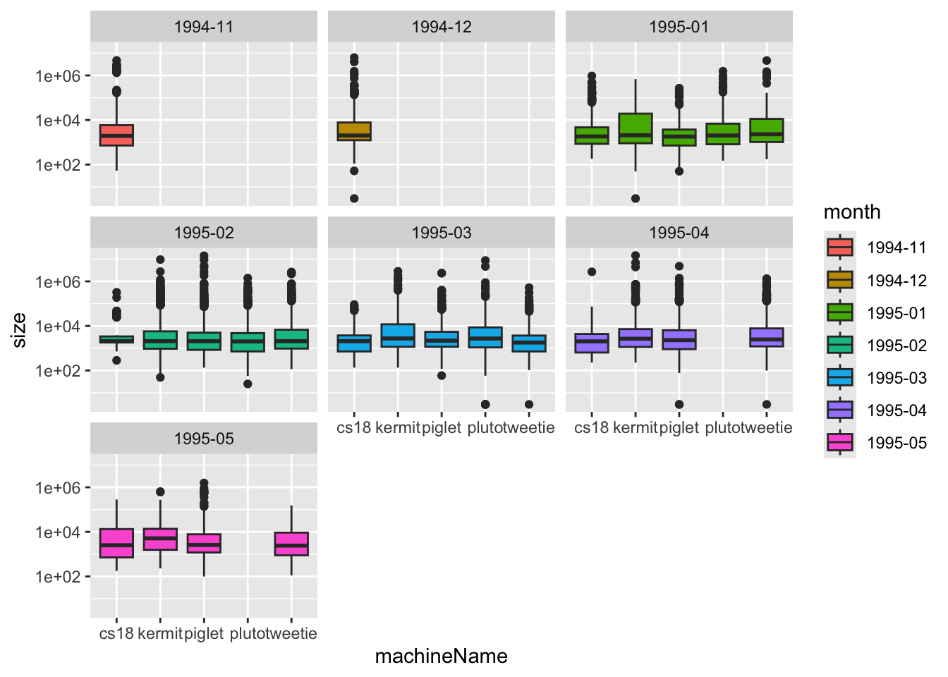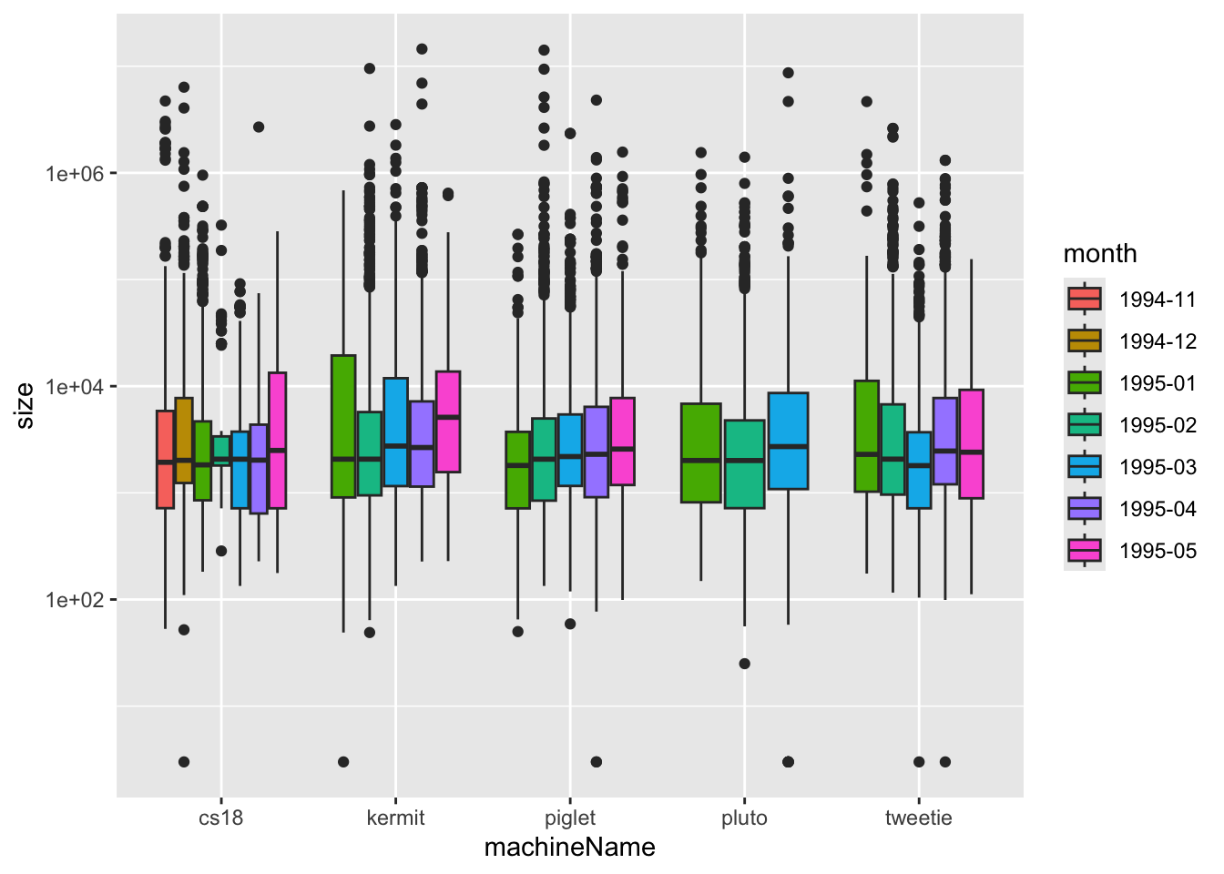 First, letβs create a previous boxplot of download size by machine and enhanced it with fill = month