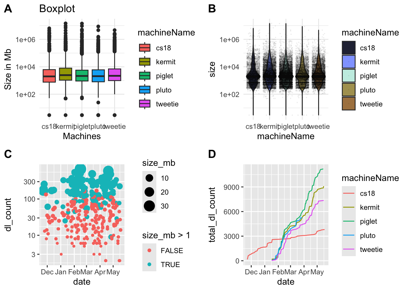 Next we want to visualize the number and the total size of the downloads done each date for each of the 6 machines. For later usage we also compute the cumulated number of downloads within each of the 6 machines over the dates. As before we do this via the following steps: