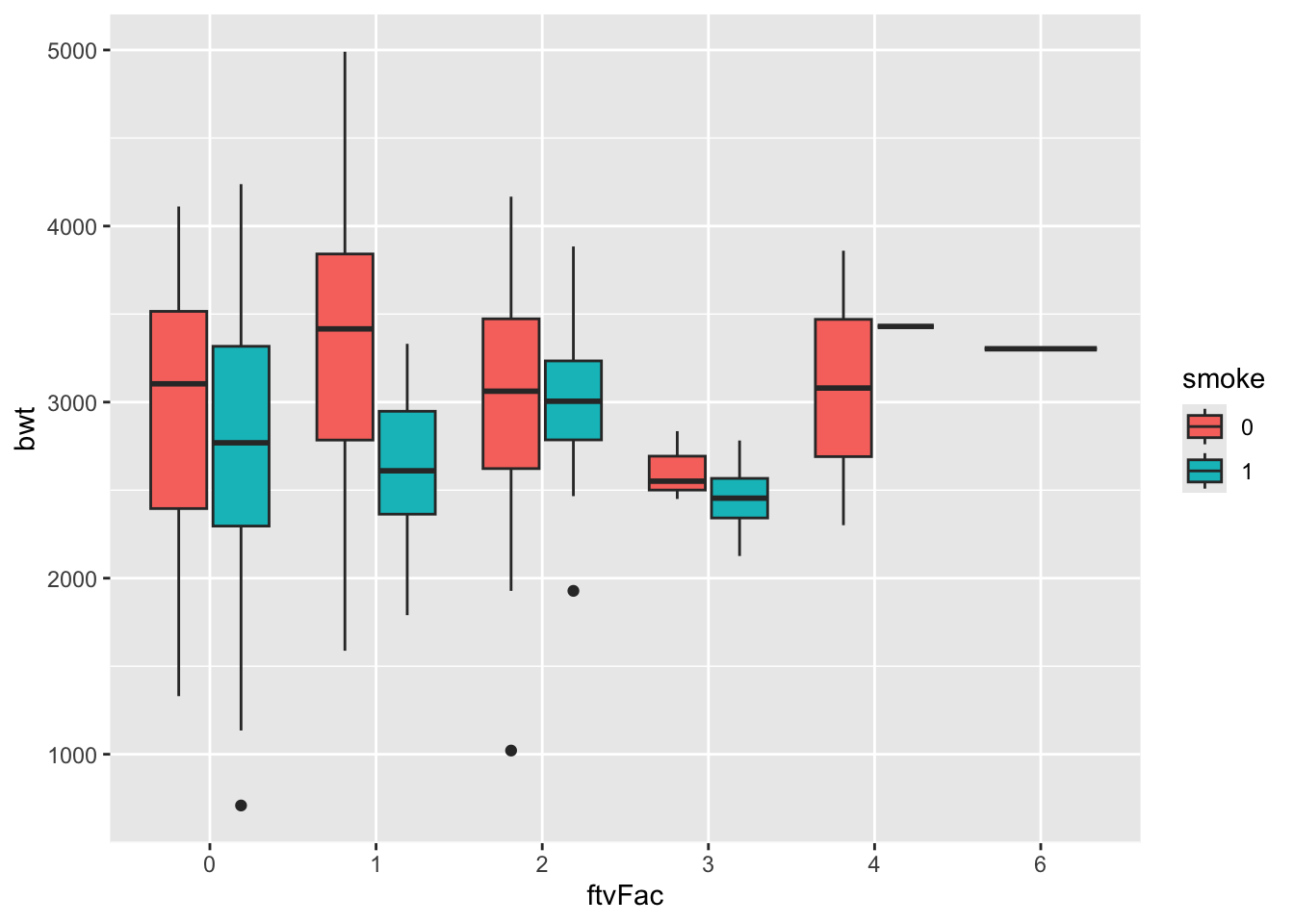 ggplot(birthData, aes(x=ftvFac, y=bwt, fill = smoke)) +