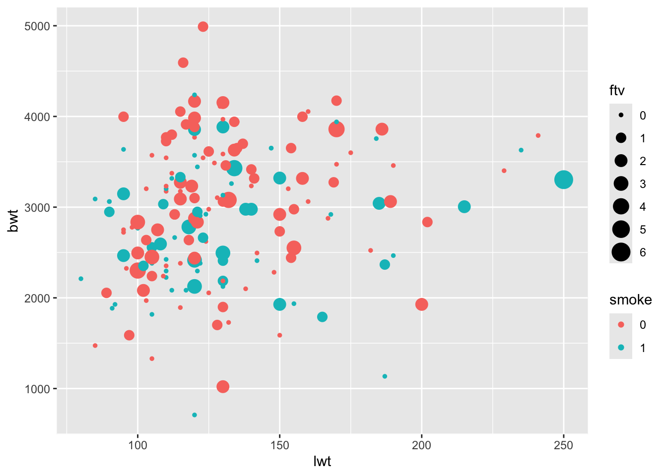 ggplot(birthData, aes(x=lwt, y=bwt, col=smoke, size = ftv)) +