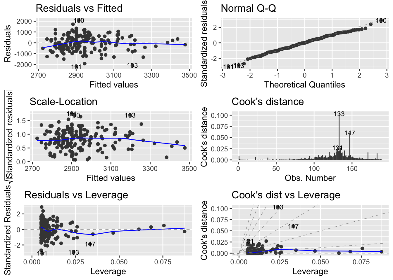 autoplot(reg1, which = 1:6, ncol = 2, label.size = 3)