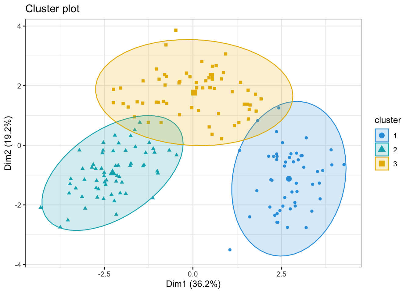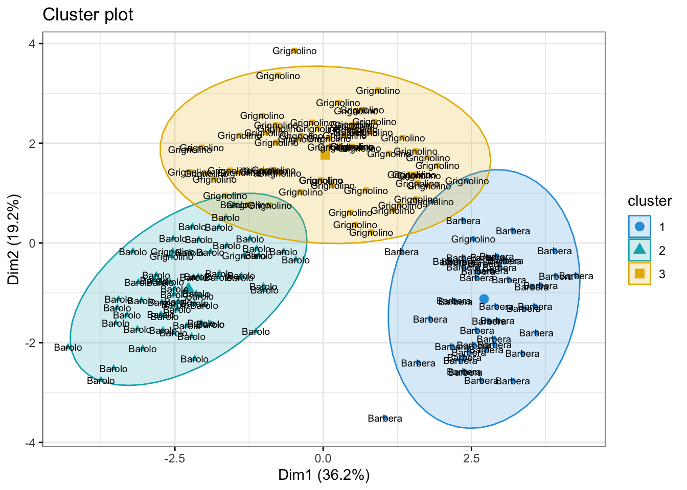 We would like to see where our wine bottles and their clusters lie in a low-dimensional space. This can easily be done using the fviz_cluster()