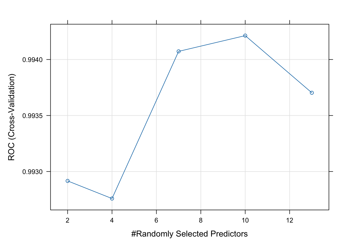 As we see from the plot above, the model performs best with four variables randomly sampled as candidates at each split (mtry = 10). There are different tuning parameters in a random forest, these include; n_estimators (number of trees), max_features (features to try at splits), max_depth (tree depth), and min_samples_split (minimum number of samples required to split a node).
