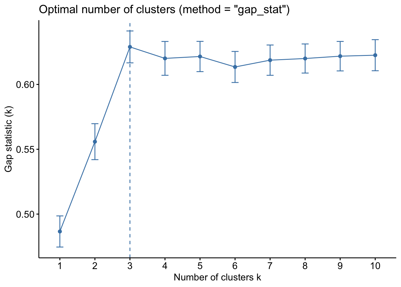 There are several ways to investigate the ideal number of clusters and fviz_nbclust from the factoextra package provides three of them: